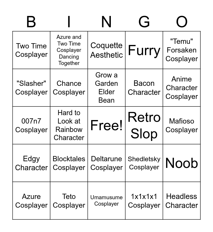 This bingo card has a free space and 24 words: Azure Cosplayer, Blocktales Cosplayer, Grow a Garden Elder Bean, 1x1x1x1 Cosplayer, "Temu" Forsaken Cosplayer, Two Time Cosplayer, Azure and Two Time Cosplayer Dancing Together, Coquette Aesthetic, Retro Slop, Mafioso Cosplayer, 007n7 Cosplayer, Chance Cosplayer, Shedletsky Cosplayer, Noob, "Slasher" Cosplayer, Teto Cosplayer, Umamusume Cosplayer, Furry, Anime Character Cosplayer, Edgy Character, Hard to Look at Rainbow Character, Deltarune Cosplayer, Bacon Character and Headless Character.