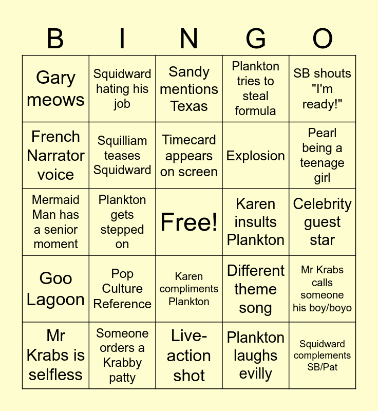 This bingo card has a free space and 45 words: Squidward insults SB/Pat, Squidward complements SB/Pat, Mr Krabs says "Money", Mr Krabs is selfless, Patchy the Pirate appears, Plankton laughs evilly, Sandy mentions Texas, Fred yells "My leg!", SB shouts "I'm ready!", Someone orders a Krabby patty, Plankton tries to steal formula, Karen insults Plankton, Karen compliments Plankton, Pop Culture Reference, Gross close-up, Live-action shot, Breaking the laws of physics, Mermaid Man has a senior moment, Mrs Puff puffs up, Pearl being a teenage girl, Squidward hating his job, Jellyfish is caught, SB fails boating test, Gary meows, Dirty joke, Celebrity guest star, Larry flexes his muscles, Squidward plays clarinet, Different theme song, Goo Lagoon, Karate!, Mr Krabs calls someone his boy/boyo, Flying Dutchman appears, Sandy does science, SB laughs iconically, Plankton gets stepped on, Pat says something smart, Gay moment, Order bell rings, Timecard appears on screen, French Narrator voice, Explosion, Pat says something dumb, Squilliam teases Squidward and Squilliam flaunts his wealth.