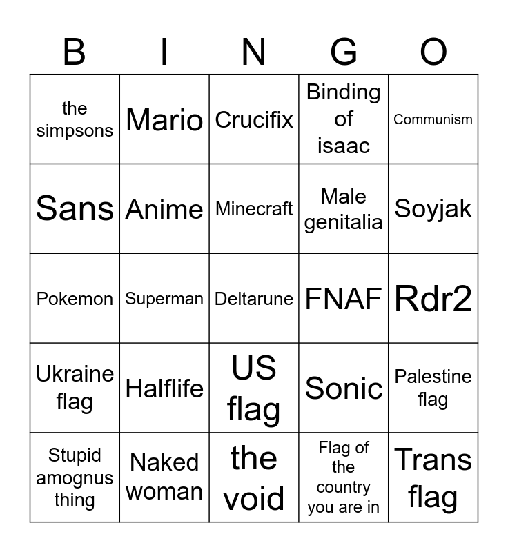 This bingo card has a free space and 24 words: Halflife, Naked woman, Minecraft, Stupid amognus thing, Communism, the simpsons, Sans, Mario, FNAF, US flag, Male genitalia, Pokemon, Sonic, Palestine flag, Anime, Flag of the country you are in, Rdr2, Crucifix, Soyjak, Superman, Trans flag, Ukraine flag, Binding of isaac and the void.
