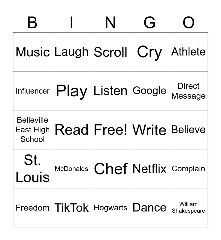 This bingo card has a free space and 24 words: McDonalds, TikTok, Listen, Freedom, Athlete, Music, Influencer, Laugh, Write, Chef, Google, Belleville East High School, Netflix, Complain, Play, Dance, Believe, Scroll, Direct Message, Read, William Shakespeare, St. Louis, Cry and Hogwarts.