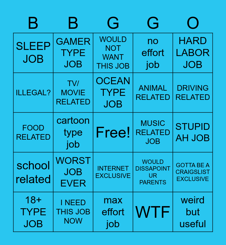 This bingo card has a free space and 24 words: WORST JOB EVER, I NEED THIS JOB NOW, OCEAN TYPE JOB, 18+ TYPE JOB, HARD LABOR JOB, SLEEP JOB, ILLEGAL?, GAMER TYPE JOB, MUSIC RELATED JOB, INTERNET EXCLUSIVE, ANIMAL RELATED, FOOD RELATED, WOULD DISSAPOINT UR PARENTS, GOTTA BE A CRAIGSLIST EXCLUSIVE, TV/ MOVIE RELATED, WTF, STUPID AH JOB, WOULD NOT WANT THIS JOB, DRIVING RELATED, cartoon type job, weird but useful, school related, no effort job and max effort job.
