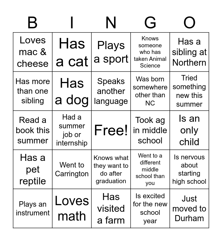 This bingo card has a free space and 24 words: Went to Carrington, Loves math, Speaks another language, Plays an instrument, Has a sibling at Northern, Loves mac & cheese, Has more than one sibling, Has a cat, Took ag in middle school, Knows what they want to do after graduation, Was born somewhere other than NC, Read a book this summer, Went to a different middle school than you, Is nervous about starting high school, Has a dog, Is excited for the new school year, Is an only child, Plays a sport, Tried something new this summer, Had a summer job or internship, Just moved to Durham, Has a pet reptile, Knows someone who has taken Animal Science and Has visited a farm.