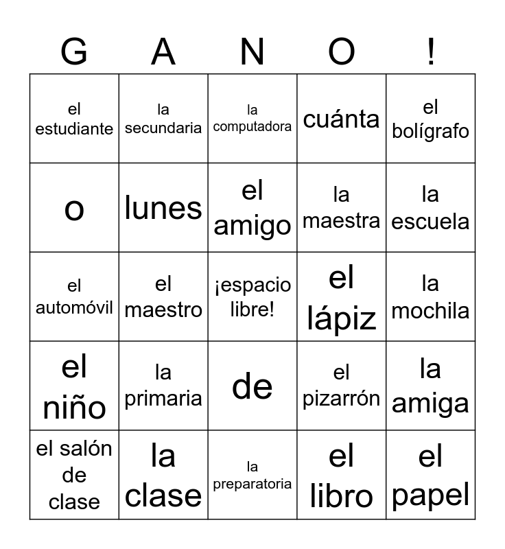 This bingo card has a free space and 35 words: penúltima, ayer, fin de semana, lunes, de, cuánta, o, y, el amigo, el autobús, el automóvil, el bolígrafo, el cuaderno, el escritorio, el estudiante, el lápiz, el libro, el maestro, el niño, el papel, el pizarrón, el salón de clase, la amiga, la clase, la computadora, la escuela, la estudiante, la impresora, la maestra, la mochila, la niña, la preparatoria, la primaria, la secundaria and la silla.