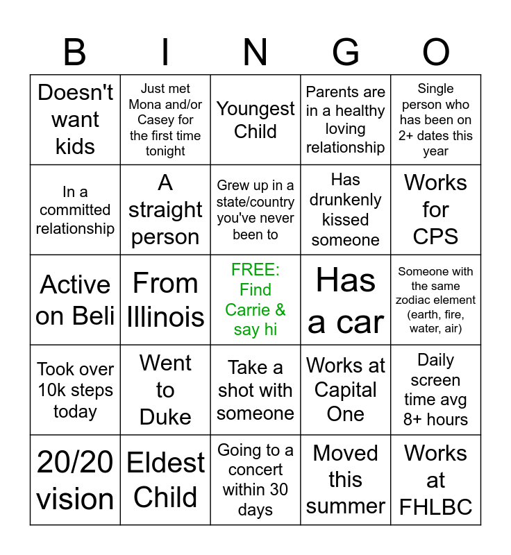 This bingo card has a free space and 24 words: Went to Duke, Eldest Child, Grew up in a state/country you've never been to, 20/20 vision, Single person who has been on 2+ dates this year, Doesn't want kids, In a committed relationship, Just met Mona and/or Casey for the first time tonight, Has a car, Take a shot with someone, Has drunkenly kissed someone, Active on Beli, Works at Capital One, Daily screen time avg 8+ hours, A straight person, Moved this summer, Someone with the same zodiac element (earth, fire, water, air), Youngest Child, Works for CPS, From Illinois, Works at FHLBC, Took over 10k steps today, Parents are in a healthy loving relationship and Going to a concert within 30 days.