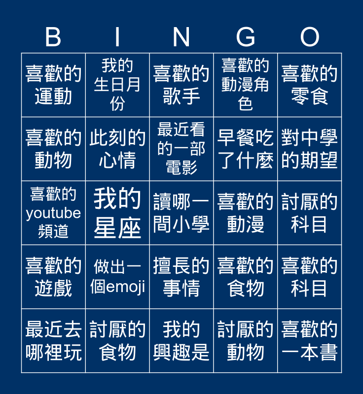 This bingo card has 25 words: 做出一個emoji, 我的 興趣是, 最近看的一部電影, 最近去哪裡玩, 喜歡的零食, 喜歡的運動, 喜歡的動物, 我的 生日月份, 喜歡的動漫, 擅長的事情, 早餐吃了什麼, 喜歡的youtube頻道, 喜歡的食物, 喜歡的科目, 此刻的心情, 喜歡的一本書, 討厭的科目, 喜歡的歌手, 對中學 的期望, 我的星座, 讀哪一間小學, 討厭的食物, 喜歡的遊戲, 喜歡的動漫角色 and 討厭的動物.