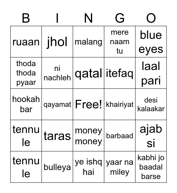 This bingo card has a free space and 24 words: taras, bulleya, qatal, tennu le, blue eyes, ruaan, thoda thoda pyaar, jhol, khairiyat, money money, itefaq, hookah bar, barbaad, ajab si, ni nachleh, yaar na miley, desi kalaakar, malang, laal pari, qayamat, kabhi jo baadal barse, tennu le, mere naam tu and ye ishq hai.