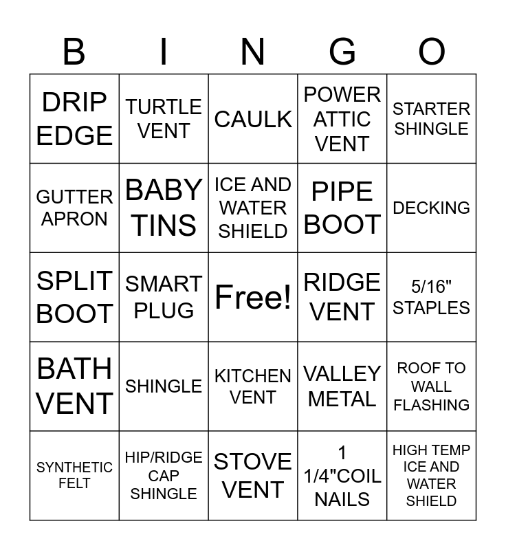 This bingo card has a free space and 24 words: SHINGLE, HIP/RIDGE CAP SHINGLE, ICE AND WATER SHIELD, SYNTHETIC FELT, STARTER SHINGLE, DRIP EDGE, GUTTER APRON, TURTLE VENT, RIDGE VENT, KITCHEN VENT, PIPE BOOT, SPLIT BOOT, VALLEY METAL, ROOF TO WALL FLASHING, BABY TINS, 1 1/4"COIL NAILS, 5/16" STAPLES, CAULK, DECKING, SMART PLUG, HIGH TEMP ICE AND WATER SHIELD, BATH VENT, POWER ATTIC VENT and STOVE VENT.