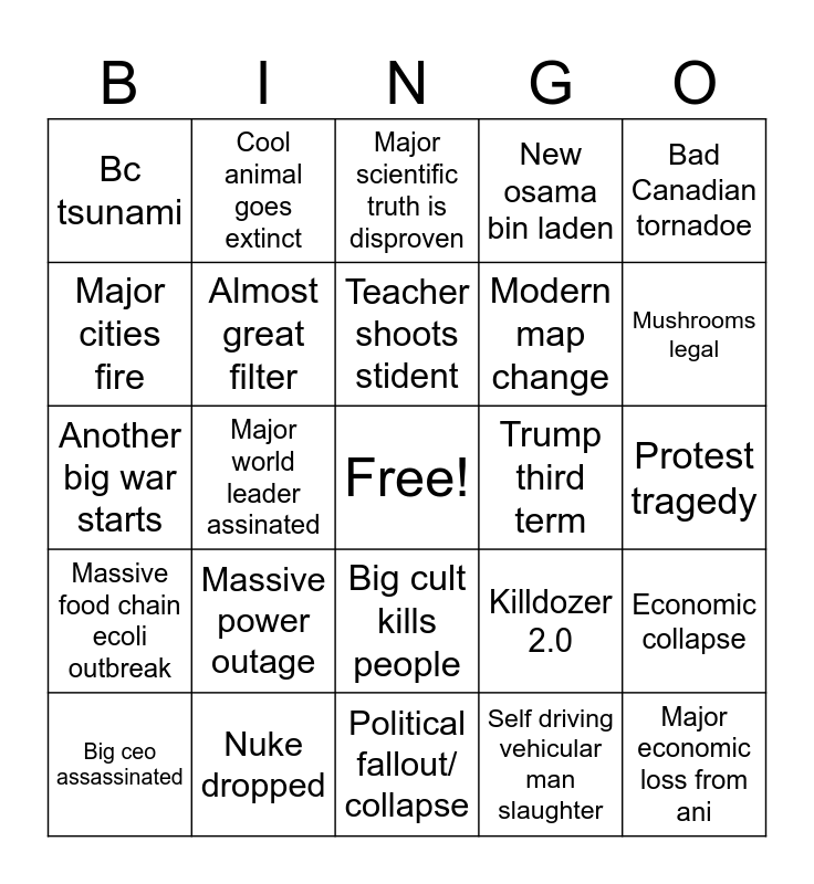 This bingo card has a free space and 24 words: Massive power outage, Nuke dropped, Teacher shoots stident, Big ceo assassinated, Bad Canadian tornadoe, Bc tsunami, Major cities fire, Cool animal goes extinct, Trump third term, Big cult kills people, Modern map change, Another big war starts, Killdozer 2.0, Economic collapse, Almost great filter, Self driving vehicular man slaughter, Protest tragedy, Major scientific truth is disproven, Mushrooms legal, Major world leader assinated, Major economic loss from ani, Massive food chain ecoli outbreak, New osama bin laden and Political fallout/ collapse.
