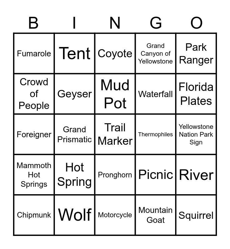 This bingo card has 38 words: Free!, Buffalo, Bear, Geyser, River, Hot Spring, Mud Pot, Elk, Park Ranger, Waterfall, Grand Prismatic, Grand Canyon of Yellowstone, Trail Marker, Yellowstone Nation Park Sign, Crowd of People, Mammoth Hot Springs, Old Faithful, Coyote, Morning Glory Pool, Thermophiles, Fumarole, Wolf, Florida Plates, Chipmunk, Deer, Motorcycle, Squirrel, Moose, Baby Buffalo, Bald Eagle, Pika, Pronghorn, Mountain Goat, Tent, Camper, Picnic, Foreigner and Dragon’s Mouth.