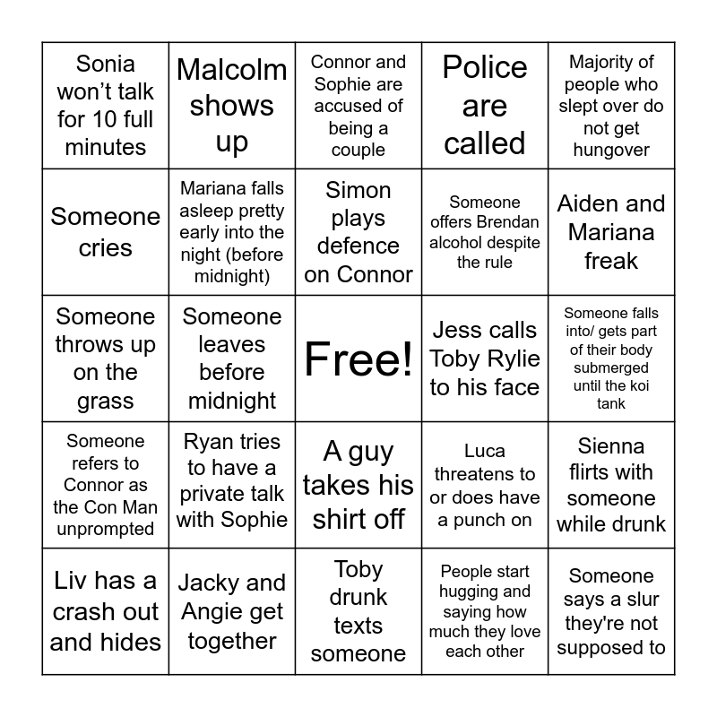 This bingo card has a free space and 24 words: Ryan tries to have a private talk with Sophie, Jacky and Angie get together, Simon plays defence on Connor, Liv has a crash out and hides, Majority of people who slept over do not get hungover, Sonia won’t talk for 10 full minutes, Someone cries, Malcolm shows up, Jess calls Toby Rylie to his face, A guy takes his shirt off, Someone offers Brendan alcohol despite the rule, Someone throws up on the grass, Luca threatens to or does have a punch on, Sienna flirts with someone while drunk, Mariana falls asleep pretty early into the night (before midnight), People start hugging and saying how much they love each other, Someone falls into/ gets part of their body submerged until the koi tank, Connor and Sophie are accused of being a couple, Aiden and Mariana freak, Someone leaves before midnight, Someone says a slur they're not supposed to, Someone refers to Connor as the Con Man unprompted, Police are called and Toby drunk texts someone.