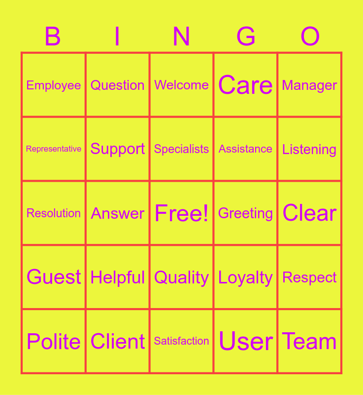 This bingo card has a free space and 59 words: Customer, Client, Consumer, Guest, User, Patron, Support, Service, Assistance, Help, Care, Agent, Representative, Associate, Staff, Employee, Team, Manager, Supervisor, Specialists, Greeting, Welcome, Polite, Respect, Kindness, Friendly, Professional, Patient, Listening, Understanding, Problem, Issue, Complaint, Concern, Question, Request, Solution, Answer, Response, Resolution, Supportive, Helpful, Clear, Direct, Honest, Reliable, Fast, Efficient, Quality, Satisfaction, Feedback, Survey, Rating, Review, Experience, Loyalty, Return, Exchange and Refund.