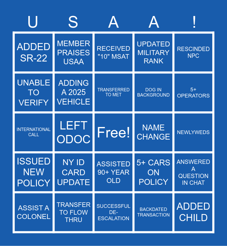 This bingo card has a free space and 40 words: I NEVER SET UP A PIN, INTERNATIONAL CALL, ADDING A 2026 VEHICLE, ADDING A 2025 VEHICLE, TRANSFER TO FLOW THRU, ASSISTED 90+ YEAR OLD, TRANSFERRED TO MET, USED ACE, RESCINDED NPC, ISSUED NEW POLICY, LEFT ODOC, UPDATED MILITARY RANK, ADDED CHILD, NEWLYWEDS, NAME CHANGE, NY ID CARD UPDATE, SENT NC FS1, ADDED SR-22, ENROLLED IN SAFE PILOT, RECEIVED "10" MSAT, ANSWERED A QUESTION IN CHAT, BACKDATED TRANSACTION, DOG IN BACKGROUND, UNABLE TO VERIFY, 60-YEAR TENURE, EMPLOYEE OR EX-EMPLOYEE ACCOUNT, REBASE, SET UP APP, SET UP SPA, 3RD-PARTY CALL, KBA QUESTIONS, ASSIST A COLONEL, SRT TRANSFER, 5+ CARS ON POLICY, 5+ OPERATORS, SUCCESSFUL DE-ESCALATION, "I HATE YOUR AI SYSTEM", PASSWORD HINT: N/A, MEMBER PRAISES USAA and SENT BENEFICIARY FORM.