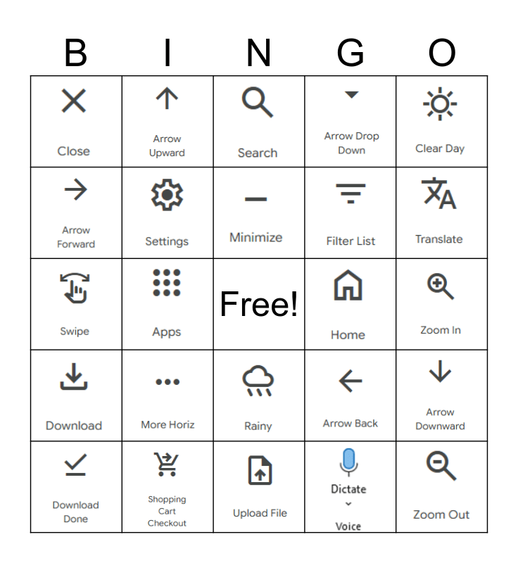 This bingo card has 29 images and a free space.