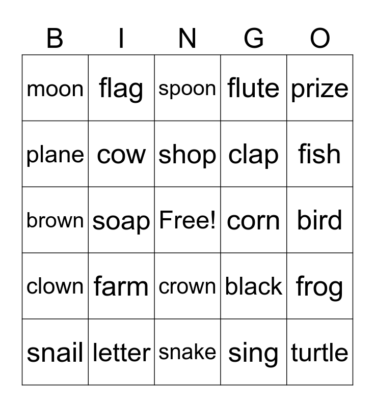 This bingo card has a free space and 29 words: snail, seal, soap, toy, moon, spoon, cow, farm, corn, letter, bird, turtle, snake, sing, fish, whale, crown, clown, prize, brown, black, blue, clap, plane, flute, flag, frog, shop and ship.