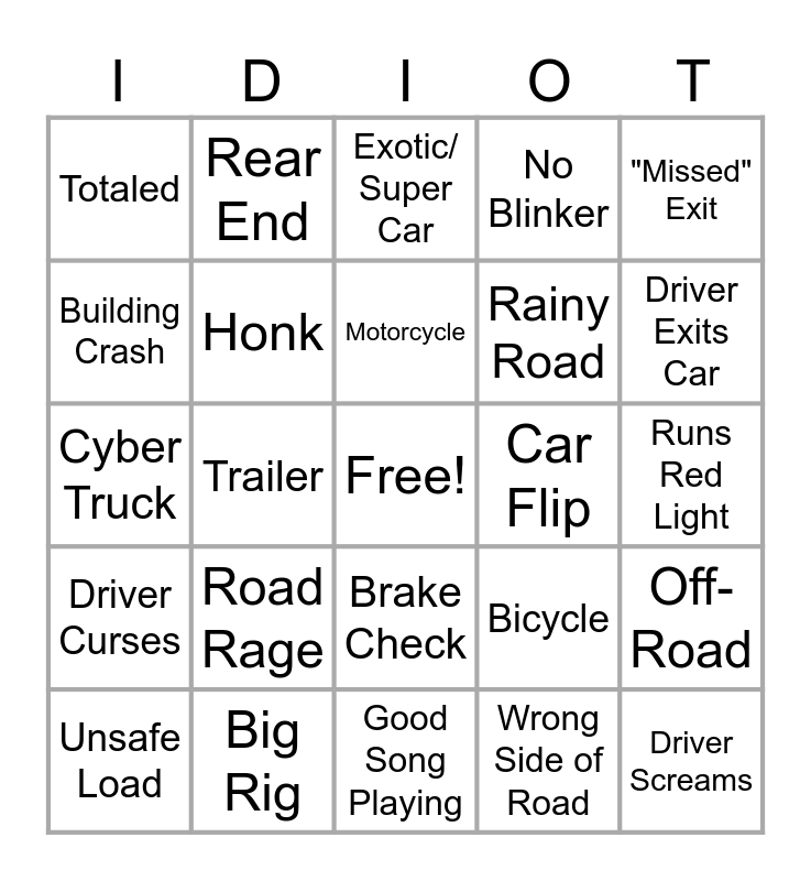 This bingo card has a free space and 29 words: Unsafe Load, Snowy Road, Trailer, Tire Falls Off, Totaled, Exotic/ Super Car, Honk, Road Rage, Car Flip, Big Rig, Runs Red Light, Driver Screams, Good Song Playing, Wrong Side of Road, Driver Exits Car, Cop Shows Up, Brake Check, Driver Curses, "Missed" Exit, Cyber Truck, Bicycle, Parking Lot, Rainy Road, Building Crash, No Blinker, Rear End, Off-Road, Motorcycle and Cut Off.
