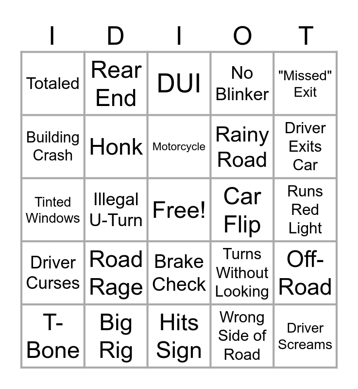 This bingo card has a free space and 29 words: T-Bone, Sideswipe, Illegal U-Turn, Backed Into To, Totaled, DUI, Honk, Road Rage, Car Flip, Big Rig, Runs Red Light, Driver Screams, Hits Sign, Wrong Side of Road, Driver Exits Car, Cop Shows Up, Brake Check, Driver Curses, "Missed" Exit, Tinted Windows, Turns Without Looking, Parking Lot, Rainy Road, Building Crash, No Blinker, Rear End, Off-Road, Motorcycle and Cut Off.