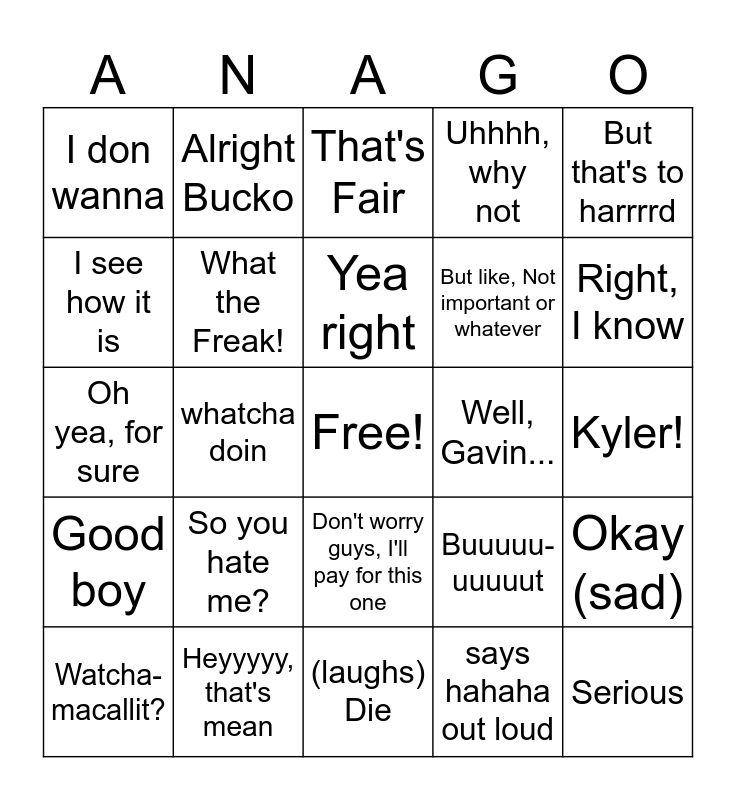 This bingo card has a free space and 24 words: Watcha-macallit?, So you hate me?, Yea right, says hahaha out loud, But that's to harrrrd, I don wanna, Alright Bucko, That's Fair, Well, Gavin..., Kyler!, Oh yea, for sure, What the Freak!, Buuuuu-uuuuut, Okay (sad), I see how it is, Heyyyyy, that's mean, (laughs) Die, Uhhhh, why not, Right, I know, Good boy, whatcha doin, Don't worry guys, I'll pay for this one, But like, Not important or whatever and Serious.