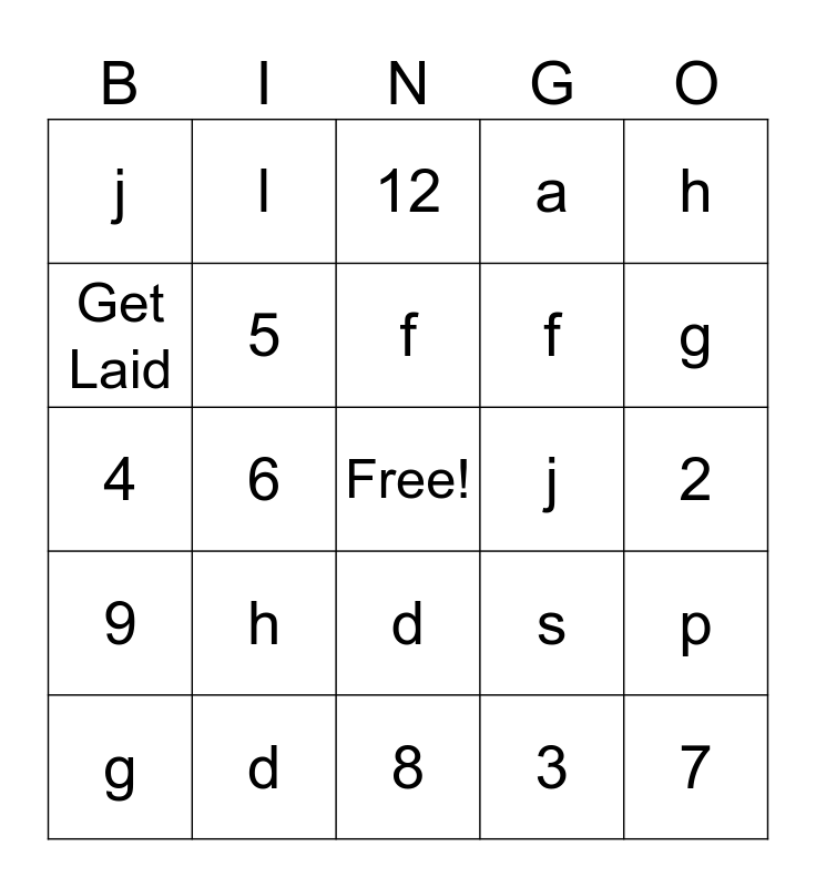 This bingo card has a free space and 24 words: h, d, f, g, h, j, Get Laid, l, j, d, f, 4, s, p, 5, 3, 2, 12, g, 6, 7, 9, a and 8.
