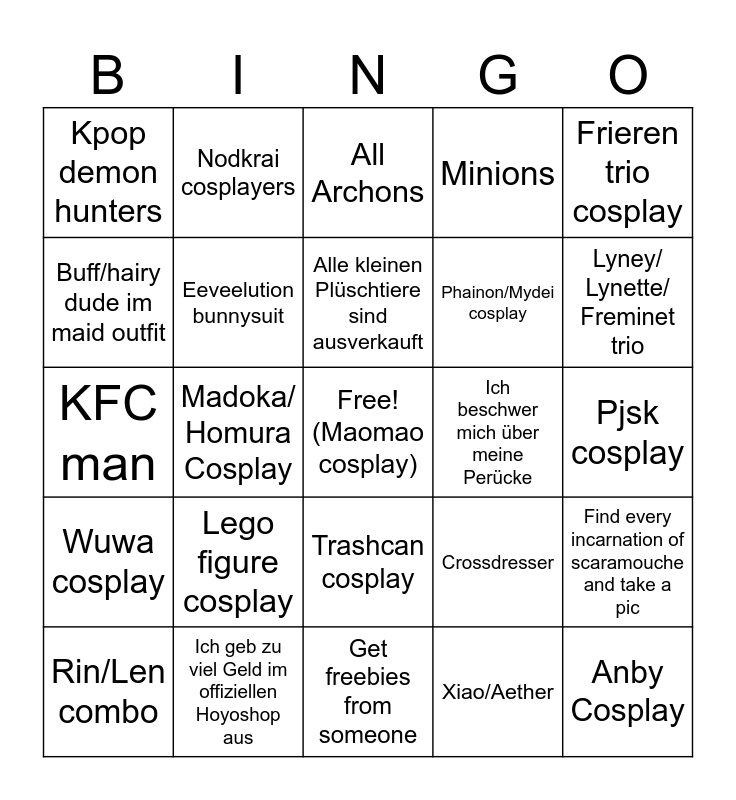 This bingo card has a free space and 24 words: Lego figure cosplay, Ich geb zu viel Geld im offiziellen Hoyoshop aus, Alle kleinen Plüschtiere sind ausverkauft, Rin/Len combo, Frieren trio cosplay, Kpop demon hunters, Buff/hairy dude im maid outfit, Nodkrai cosplayers, Ich beschwer mich über meine Perücke, Trashcan cosplay, Phainon/Mydei cosplay, KFC man, Crossdresser, Find every incarnation of scaramouche and take a pic, Eeveelution bunnysuit, Xiao/Aether, Pjsk cosplay, All Archons, Lyney/ Lynette/ Freminet trio, Madoka/ Homura Cosplay, Anby Cosplay, Wuwa cosplay, Minions and Get freebies from someone.