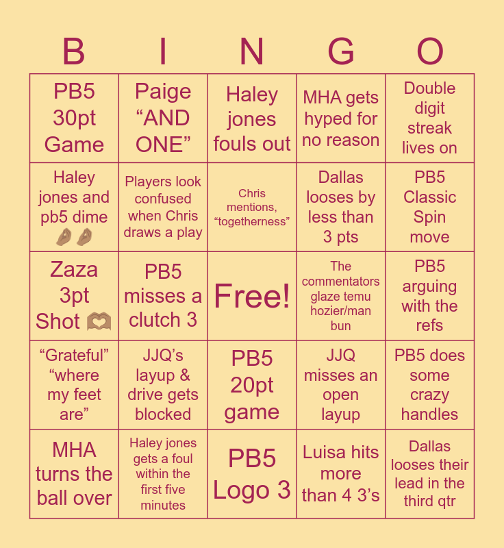 This bingo card has a free space and 24 words: JJQ’s layup & drive gets blocked, Haley jones gets a foul within the first five minutes, Chris mentions, “togetherness”, MHA turns the ball over, Double digit streak lives on, PB5 30pt Game, Haley jones and pb5 dime 🤌🏽🤌🏽, Paige “AND ONE”, The commentators glaze temu hozier/man bun, PB5 20pt game, Dallas looses by less than 3 pts, Zaza 3pt Shot 🫶🏽, JJQ misses an open layup, PB5 does some crazy handles, Players look confused when Chris draws a play, Luisa hits more than 4 3’s, PB5 arguing with the refs, Haley jones fouls out, PB5 Classic Spin move, PB5 misses a clutch 3, Dallas looses their lead in the third qtr, “Grateful” “where my feet are”, MHA gets hyped for no reason and PB5 Logo 3.