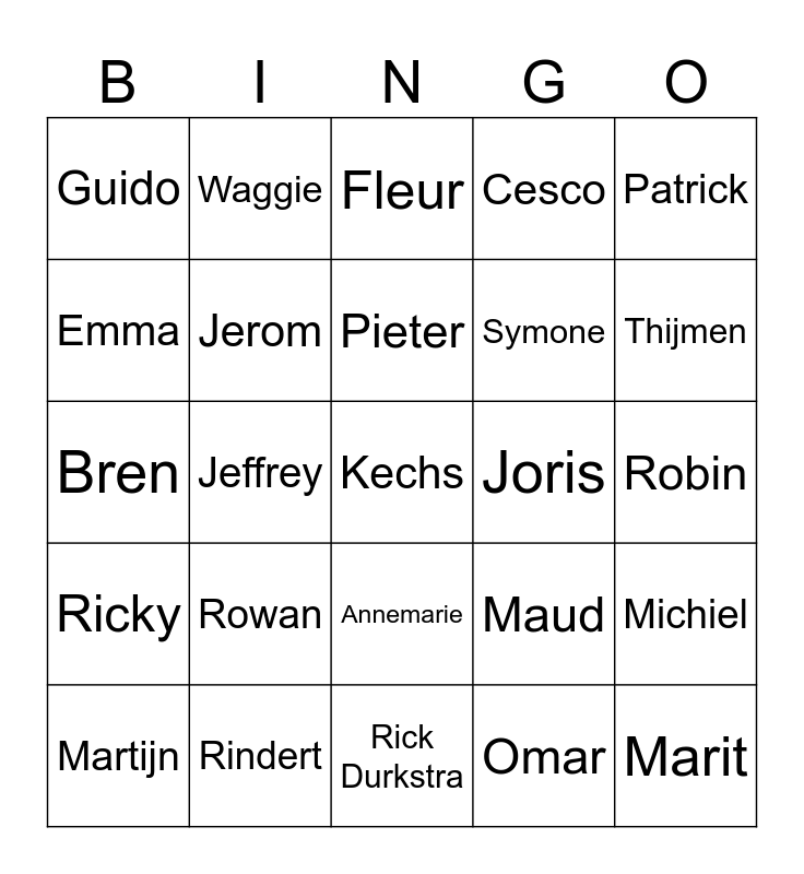 This bingo card has a free space and 24 words: Rowan, Rindert, Pieter, Martijn, Patrick, Guido, Emma, Waggie, Joris, Annemarie, Symone, Bren, Maud, Michiel, Jerom, Omar, Robin, Fleur, Thijmen, Jeffrey, Marit, Ricky, Cesco and Rick Durkstra.