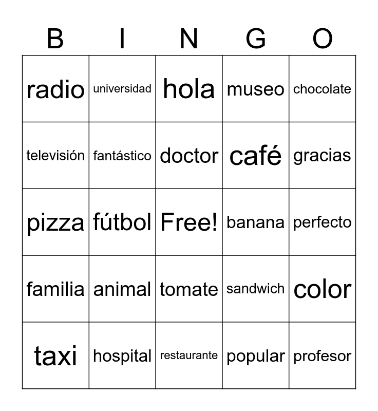 This bingo card has a free space and 24 words: animal, hospital, doctor, taxi, chocolate, radio, televisión, universidad, banana, tomate, café, pizza, sandwich, color, fantástico, popular, perfecto, hola, gracias, fútbol, profesor, familia, museo and restaurante.