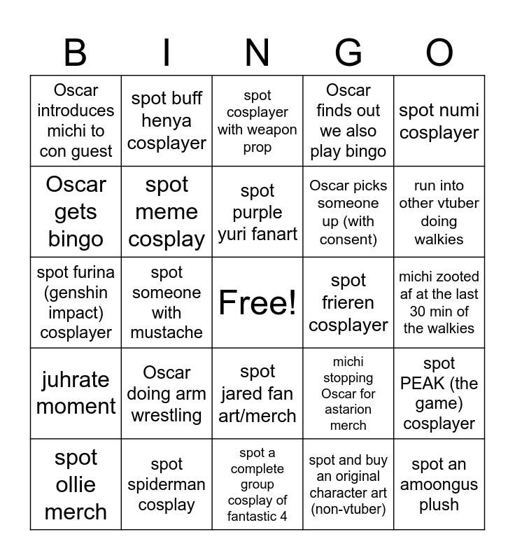This bingo card has a free space and 33 words: spot a jared cosplayer, spot a furry cosplayer, spot someone with mustache, spot someone wearing michi merch, juhrate moment, spot meme cosplay, spot numi cosplayer, spot ollie merch, spot buff henya cosplayer, spot someone proposing to a vtuber, spot purple yuri fanart, spot cosplayer with weapon prop, michi spends $2k+, spot a herd of uma musume cosplayer, spot frieren cosplayer, run into other vtuber doing walkies, spot spiderman cosplay, spot furina (genshin impact) cosplayer, Oscar doing arm wrestling, michi stopping Oscar for astarion merch, spot jared fan art/merch, spot ironmouse's model designer, Oscar introduces michi to con guest, michi zooted af at the last 30 min of the walkies, spot a complete group cosplay of fantastic 4, spot an amoongus plush, Oscar finds out we also play bingo, Oscar picks someone up (with consent), Oscar gets bingo, spot PEAK (the game) cosplayer, michi covers the screen for censor, spot and buy an original character art (non-vtuber) and spot an actual rat.