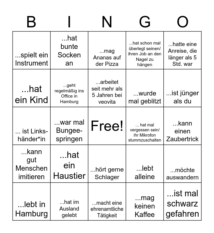 This bingo card has a free space and 24 words: ...hat ein Haustier, ...hat im Ausland gelebt, ...arbeitet seit mehr als 5 Jahren bei veovita, ...lebt in Hamburg, ...hatte eine Anreise, die länger als 5 Std. war, ...spielt ein Instrument, ...hat ein Kind, ...hat bunte Socken an, ... hat mal vergessen sein/ ihr Mikrofon stummzuschalten, ...hört gerne Schlager, ...wurde mal geblitzt, ... ist Links-händer*in, ...lebt alleine, ...möchte auswandern, ...geht regelmäßig ins Office in Hamburg, ...mag keinen Kaffee, ...kann einen Zaubertrick, ...mag Ananas auf der Pizza, ...ist jünger als du, ...war mal Bungee-springen, ...ist mal schwarz gefahren, ...kann gut Menschen imitieren, ...hat schon mal überlegt seinen/ ihren Job an den Nagel zu hängen and ...macht eine ehrenamtliche Tätigkeit.