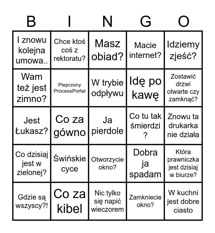 This bingo card has a free space and 24 words: Świńskie cyce, Co za kibel, W trybie odpływu, Gdzie są wszyscy?!, Idziemy zjeść?, I znowu kolejna umowa.., Wam też jest zimno?, Chce ktoś coś z rektoratu?, Co tu tak śmierdzi ?, Otworzycie okno?, Idę po kawę, Jest Łukasz?, Dobra ja spadam, Która prawniczka jest dzisiaj w biurze?, Pieprzony ProcessPortal, Zamkniecie okno?, Znowu ta drukarka nie działa, Masz obiad?, Zostawić drzwi otwarte czy zamknąć?, Co za gówno, W kuchni jest dobre ciasto, Co dzisiaj jest w zielonej?, Macie internet? and Nic tylko się napić wieczorem.