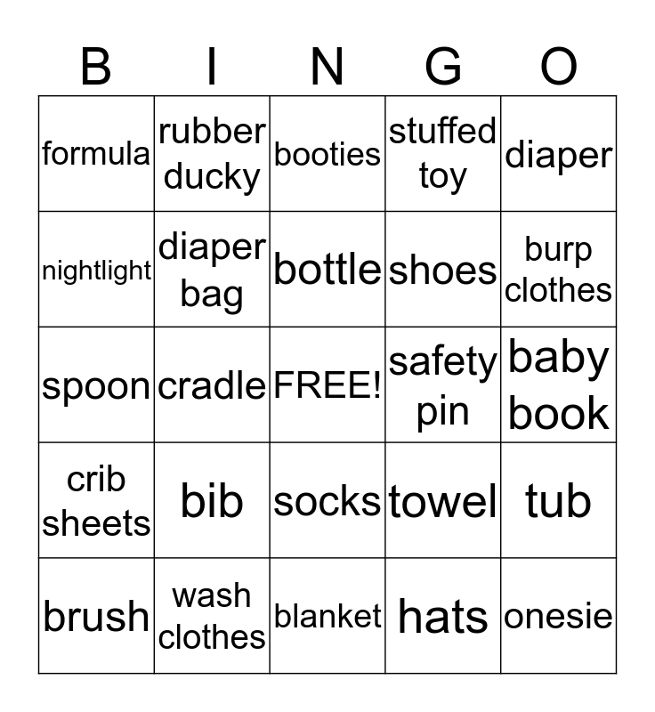 This bingo card has a free space and 25 words: bib, blanket, bottle, brush, diaper, formula, nightlight, rubber ducky, safety pin, socks, shoes, spoon, towel, tub, diaper bag, pacifier, baby book, booties, burp clothes, cradle, onesie, wash clothes, crib sheets, stuffed toy and hats.