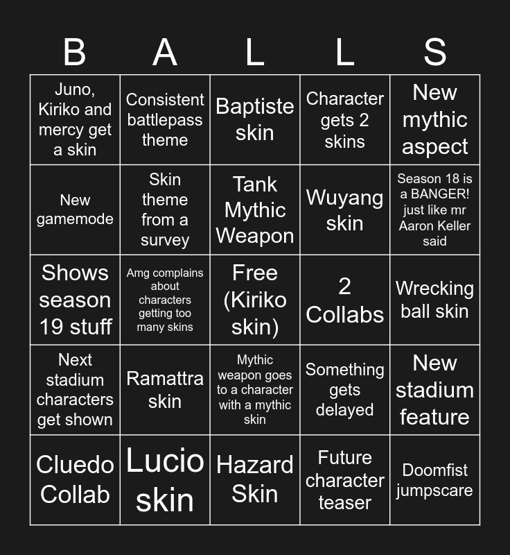 This bingo card has a free space and 24 words: Ramattra skin, Lucio skin, Tank Mythic Weapon, Cluedo Collab, New mythic aspect, Juno, Kiriko and mercy get a skin, New gamemode, Consistent battlepass theme, 2 Collabs, Mythic weapon goes to a character with a mythic skin, Wuyang skin, Shows season 19 stuff, Something gets delayed, New stadium feature, Skin theme from a survey, Future character teaser, Wrecking ball skin, Baptiste skin, Season 18 is a BANGER! just like mr Aaron Keller said, Amg complains about characters getting too many skins, Doomfist jumpscare, Next stadium characters get shown, Character gets 2 skins and Hazard Skin.