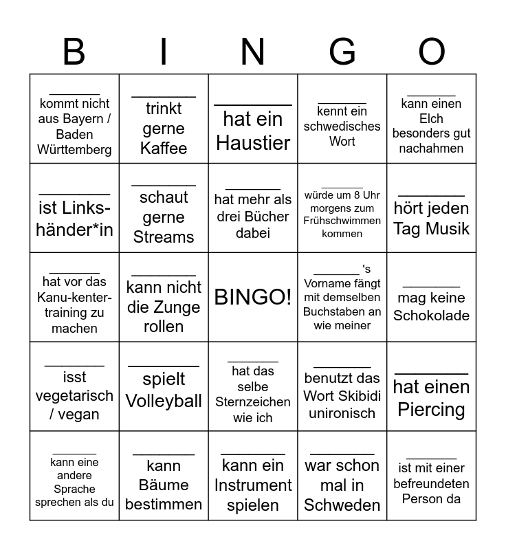 This bingo card has a free space and 24 words: _______ spielt Volleyball, _______ kann Bäume bestimmen, _______ hat mehr als drei Bücher dabei, _______ kann eine andere Sprache sprechen als du, _______ kann einen Elch besonders gut nachahmen, _______ kommt nicht aus Bayern / Baden Württemberg, _______ ist Links-händer*in, _______ trinkt gerne Kaffee, _______ 's Vorname fängt mit demselben Buchstaben an wie meiner, _______ hat das selbe Sternzeichen wie ich, _______ würde um 8 Uhr morgens zum Frühschwimmen kommen, _______ hat vor das Kanu-kenter-training zu machen, _______ benutzt das Wort Skibidi unironisch, _______ hat einen Piercing, _______ schaut gerne Streams, _______ war schon mal in Schweden, _______ mag keine Schokolade, _______ hat ein Haustier, _______ hört jeden Tag Musik, _______ kann nicht die Zunge rollen, _______ ist mit einer befreundeten Person da, _______ isst vegetarisch / vegan, _______ kennt ein schwedisches Wort and _______ kann ein Instrument spielen.