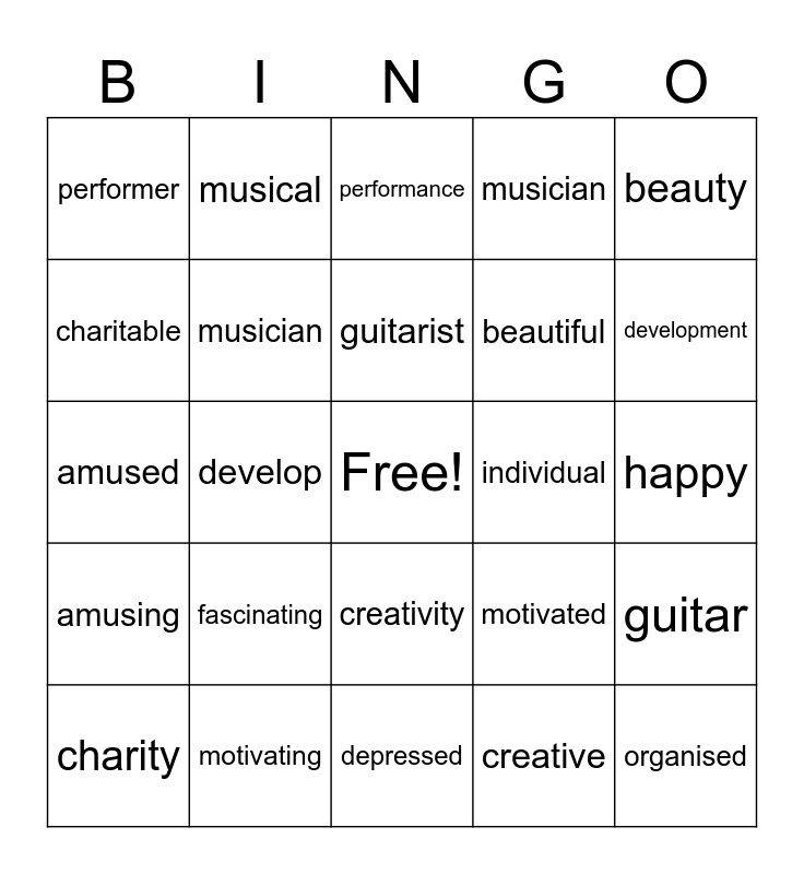 This bingo card has a free space and 29 words: charity, depressing, develop, perform, performer, performance, musician, fascinating, individual, motivating, happy, organised, depressed, creative, development, fascinated, creativity, amusing, beauty, amused, motivated, happiness, beautiful, charitable, musician, musical, guitar, guitarist and pianist.