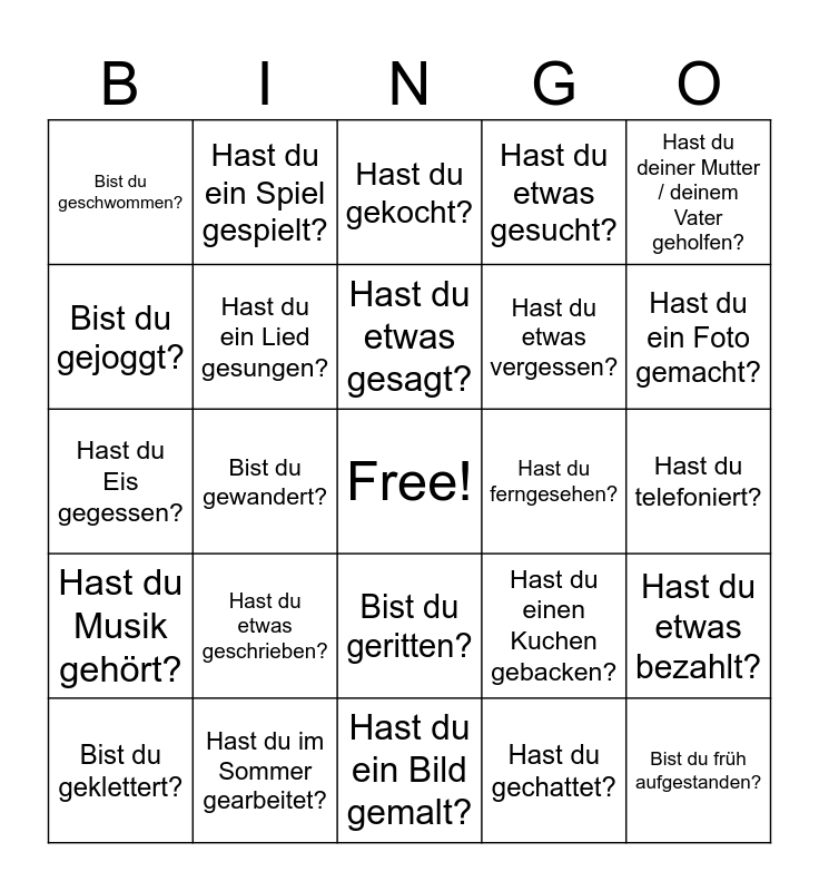 This bingo card has a free space and 30 words: Hast du im Sommer gearbeitet?, Hast du ein Buch gelesen?, Bist du gewandert?, Hast du gezeichnet?, Bist du geschwommen?, Hast du gekocht?, Hast du ein Lied gesungen?, Bist du geritten?, Hast du ferngesehen?, Hast du ein Bild gemalt?, Hast du telefoniert?, Bist du früh aufgestanden?, Hast du gechattet?, Hast du etwas gekauft?, Hast du ein Foto gemacht?, Bist du gereist oder geflogen?, Hast du einen Kuchen gebacken?, Hast du Musik gehört?, Hast du etwas geschrieben?, Hast du deiner Mutter / deinem Vater geholfen?, Hast du Eis gegessen?, Hast du Eistee getrunken?, Hast du ein Spiel gespielt?, Hast du etwas vergessen?, Bist du gejoggt?, Hast du etwas gesucht?, Hast du etwas bezahlt?, Bist du geklettert?, Hast du etwas gesagt? and Bist du spazieren gegangen?.