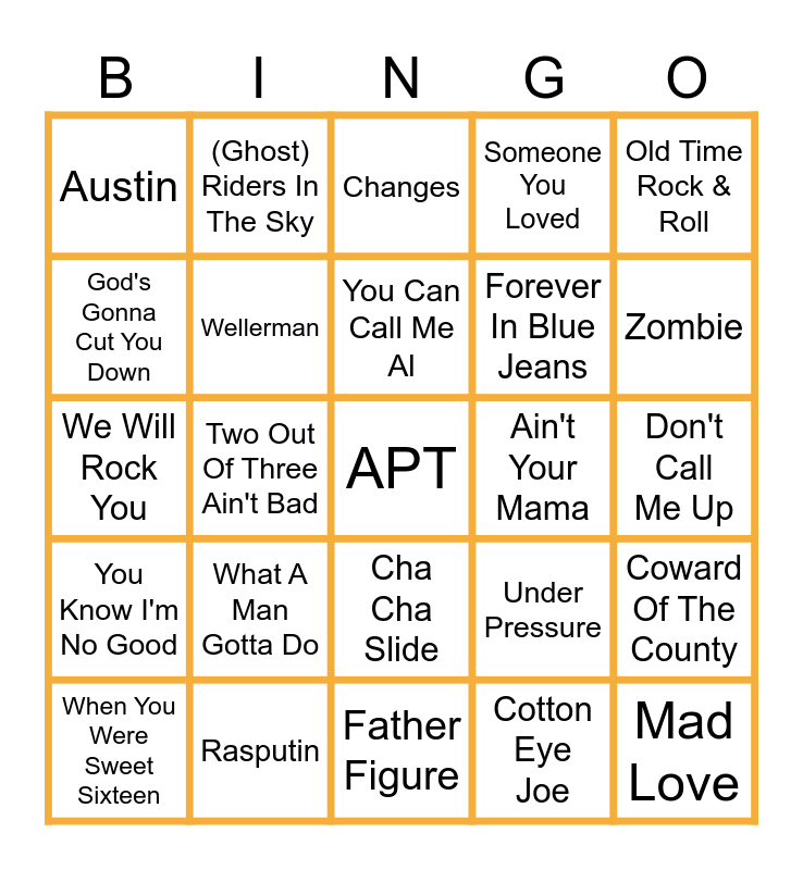 This bingo card has a free space and 29 words: When You Were Sweet Sixteen, Oh! Carol, Two Out Of Three Ain't Bad, One Way Ticket, Austin, Changes, Wellerman, What A Man Gotta Do, Ain't Your Mama, Rasputin, Don't Call Me Up, Mad Love, Father Figure, Cotton Eye Joe, Zombie, Always, Cha Cha Slide, You Know I'm No Good, Old Time Rock & Roll, We Will Rock You, Under Pressure, Iko Iko, Forever In Blue Jeans, God's Gonna Cut You Down, Someone You Loved, (Ghost) Riders In The Sky, Coward Of The County, You Can Call Me Al and You Shook Me All Night Long.