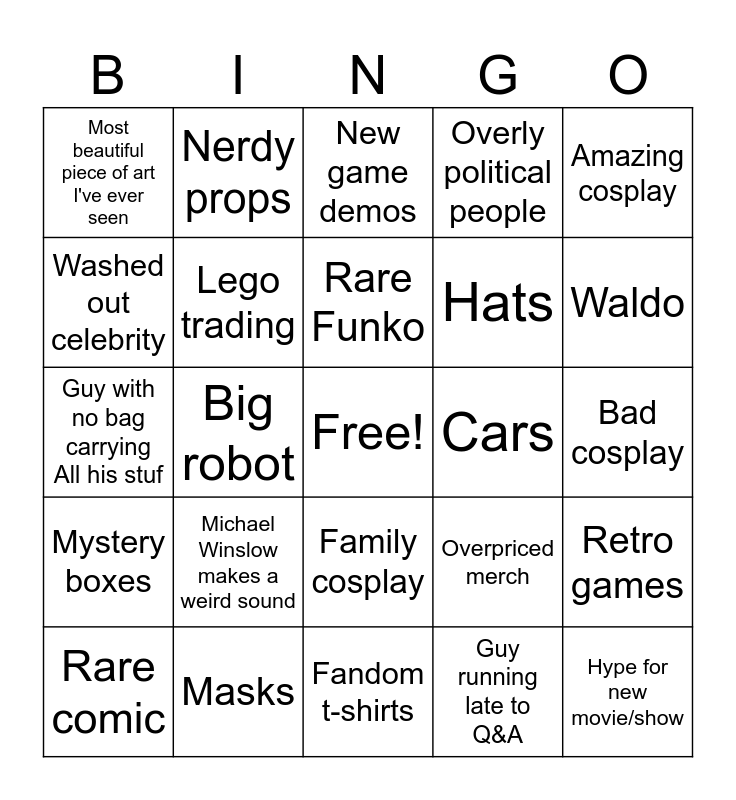 This bingo card has a free space and 24 words: Michael Winslow makes a weird sound, Masks, Rare Funko, Rare comic, Amazing cosplay, Most beautiful piece of art I've ever seen, Washed out celebrity, Nerdy props, Cars, Family cosplay, Hats, Guy with no bag carrying All his stuf, Overpriced merch, Retro games, Lego trading, Guy running late to Q&A, Bad cosplay, New game demos, Waldo, Big robot, Hype for new movie/show, Mystery boxes, Overly political people and Fandom t-shirts.