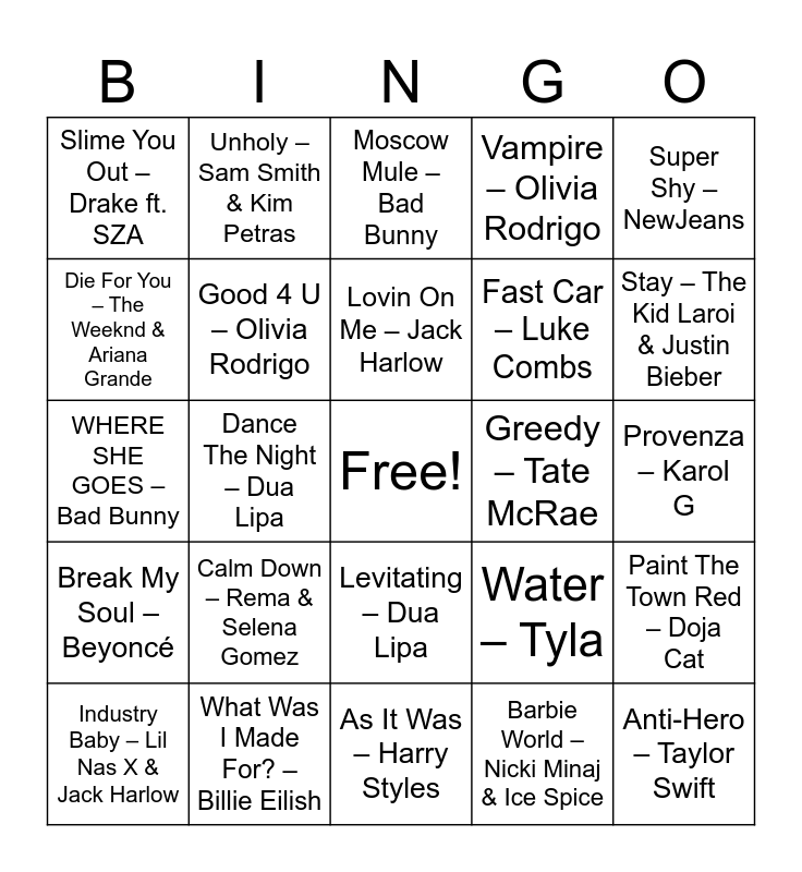 This bingo card has a free space and 49 words: Flowers – Miley Cyrus, Anti-Hero – Taylor Swift, Kill Bill – SZA, As It Was – Harry Styles, Calm Down – Rema & Selena Gomez, Creepin’ – Metro Boomin, The Weeknd, 21 Savage, Unholy – Sam Smith & Kim Petras, Last Night – Morgan Wallen, Die For You – The Weeknd & Ariana Grande, Escapism – Raye ft. 070 Shake, Good 4 U – Olivia Rodrigo, Vampire – Olivia Rodrigo, Paint The Town Red – Doja Cat, Water – Tyla, First Person Shooter – Drake ft. J. Cole, Rich Flex – Drake & 21 Savage, Lovin On Me – Jack Harlow, Greedy – Tate McRae, Seven – Jungkook ft. Latto, Super Shy – NewJeans, Dance The Night – Dua Lipa, Barbie World – Nicki Minaj & Ice Spice, Slime You Out – Drake ft. SZA, Fast Car – Luke Combs, Peaches – Justin Bieber ft. Daniel Caesar, Giveon, Stay – The Kid Laroi & Justin Bieber, Industry Baby – Lil Nas X & Jack Harlow, Montero (Call Me By Your Name) – Lil Nas X, Levitating – Dua Lipa, Break My Soul – Beyoncé, Texas Hold ’Em – Beyoncé, Body – Megan Thee Stallion, Super Freaky Girl – Nicki Minaj, Big Energy – Latto, What Was I Made For? – Billie Eilish, Bad Habit – Steve Lacy, Boy’s a Liar Pt. 2 – PinkPantheress & Ice Spice, TQG – Karol G & Shakira, Provenza – Karol G, Ella Baila Sola – Eslabon Armado & Peso Pluma, La Bebe – Yng Lvcas & Peso Pluma, Ojitos Lindos – Bad Bunny & Bomba Estéreo, Me Porto Bonito – Bad Bunny & Chencho Corleone, Tití Me Preguntó – Bad Bunny, WHERE SHE GOES – Bad Bunny, Moscow Mule – Bad Bunny, Wait For U – Future ft. Drake & Tems, Life Goes On – BTS and Savage Love – Jason Derulo x BTS.