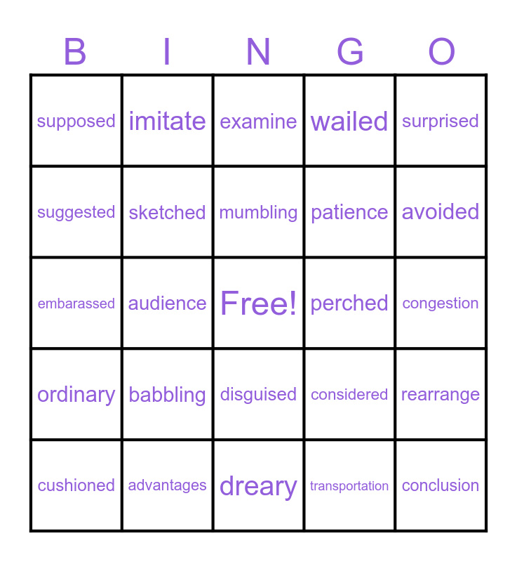 This bingo card has a free space and 24 words: babbling, advantages, mumbling, cushioned, surprised, supposed, suggested, imitate, perched, disguised, patience, embarassed, considered, rearrange, sketched, transportation, congestion, examine, avoided, audience, conclusion, ordinary, wailed and dreary.