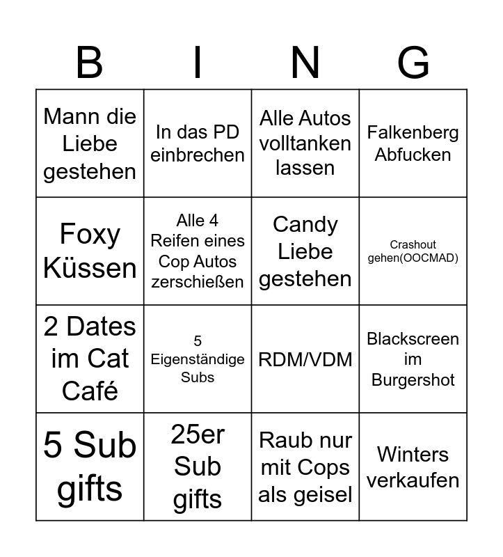 This bingo card has 16 words: 25er Sub gifts, Blackscreen im Burgershot, Alle Autos volltanken lassen, Mann die Liebe gestehen, 2 Dates im Cat Café, In das PD einbrechen, RDM/VDM, Raub nur mit Cops als geisel, Foxy Küssen, Alle 4 Reifen eines Cop Autos zerschießen, 5 Sub gifts, Falkenberg Abfucken, 5 Eigenständige Subs, Crashout gehen(OOCMAD), Candy Liebe gestehen and Winters verkaufen.