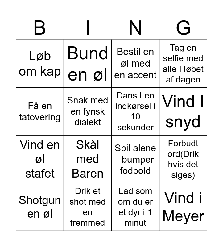 This bingo card has 16 words: Drik et shot med en fremmed, Forbudt ord(Drik hvis det siges), Bestil en øl med en accent, Løb om kap, Vind en øl stafet, Bund en øl, Spil alene i bumper fodbold, Lad som om du er et dyr i 1 minut, Få en tatovering, Snak med en fynsk dialekt, Shotgun en øl, Tag en selfie med alle I løbet af dagen, Skål med Baren, Vind I snyd, Dans I en indkørsel i 10 sekunder and Vind i Meyer.