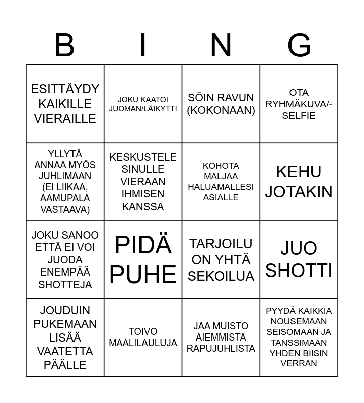This bingo card has 20 words: JUO SHOTTI, KOMPASTUIN TUOLEIHIN, SÖIN RAVUN (KOKONAAN), ALOITIN ENSIMÄISENÄ RAPULAULUT, JOUDUIN PUKEMAAN LISÄÄ VAATETTA PÄÄLLE, YLLYTÄ ANNAA MYÖS JUHLIMAAN (EI LIIKAA, AAMUPALA VASTAAVA), TOIVO MAALILAULUJA, ESITTÄYDY KAIKILLE VIERAILLE, JOKU SANOO ETTÄ EI VOI JUODA ENEMPÄÄ SHOTTEJA, JOKU KAATOI JUOMAN/LÄIKYTTI, PIDÄ PUHE, TARJOILU ON YHTÄ SEKOILUA, KESKUSTELE SINULLE VIERAAN IHMISEN KANSSA, PYYDÄ KAIKKIA NOUSEMAAN SEISOMAAN JA TANSSIMAAN YHDEN BIISIN VERRAN, KOHOTA MALJAA HALUAMALLESI ASIALLE, SAAVUTIN HUMALATILAN, KEHU JOTAKIN, OTA RYHMÄKUVA/-SELFIE, JAA MUISTO AIEMMISTA RAPUJUHLISTA and OTA VÄLIVESI.