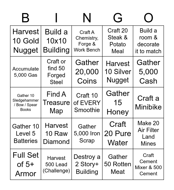 This bingo card has a free space and 24 words: Harvest 10 Raw Diamond, Harvest 500 Lead (Challenge), Gather 20,000 Coins, Full Set of 5+ Armor, Build a room & decorate it to match, Harvest 10 Gold Nugget, Accumulate 5,000 Gas, Build a 10x10 Building, Gather 15 Honey, Gather 5,000 Iron Scrap, Harvest 10 Silver Nugget, Gather 10 Sledgehammer / Bow / Spear Books, Craft 20 Pure Water, Make 20 Air Filter Land Mines, Craft or find 50 Forged Steel, Gather 50 Rotten Meat, Craft a Minibike, Craft A Chemistry, Forge & Work Bench, Gather 5,000 Cash, Find A Treasure Map, Craft Cement Mixer & 500 Cement, Gather 10 Level 5 Batteries, Craft 20 Steak & Potato Meal and Destroy a 2 Story+ Building.