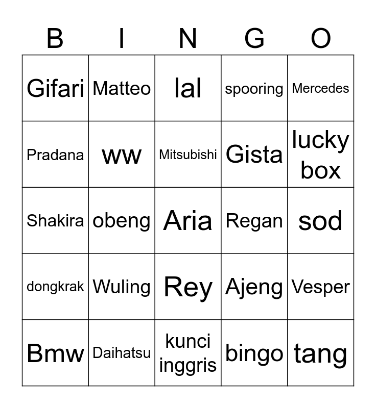 This bingo card has a free space and 24 words: Wuling, Daihatsu, Mitsubishi, Bmw, Mercedes, Gifari, Pradana, Matteo, Regan, Rey, Gista, Shakira, Ajeng, Vesper, ww, bingo, sod, lal, lucky box, obeng, tang, dongkrak, spooring and kunci inggris.