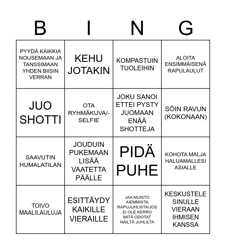 This bingo card has 20 words: KOHOTA MALJA HALUAMALLESI ASIALLE, YLLYTÄ ANNAA MUKAAN JUHLIMAAN (EI LIIKAA, AAMUPALA VASTAAVA), KOMPASTUIN TUOLEIHIN, JUO VÄLIVESI, TOIVO MAALILAULUJA, JUO SHOTTI, ESITTÄYDY KAIKILLE VIERAILLE, PYYDÄ KAIKKIA NOUSEMAAN JA TANSSIMAAN YHDEN BIISIN VERRAN, SAAVUTIN HUMALATILAN, KEHU JOTAKIN, JOUDUIN PUKEMAAN LISÄÄ VAATETTA PÄÄLLE, PIDÄ PUHE, OTA RYHMÄKUVA/-SELFIE, KESKUSTELE SINULLE VIERAAN IHMISEN KANSSA, JOKU SANOI ETTEI PYSTY JUOMAAN ENÄÄ SHOTTEJA, TARJOILU ON YHTÄ SEKOILUA, SÖIN RAVUN (KOKONAAN), ALOITA ENSIMMÄISENÄ RAPULAULUT, JAA MUISTO AIEMMISTA RAPUJUHLISTA/JOS EI OLE KERRO MITÄ ODOTAT NÄILTÄ JUHLILTA and JOKU KAATOI JUOMAN/LÄIKYTTI.