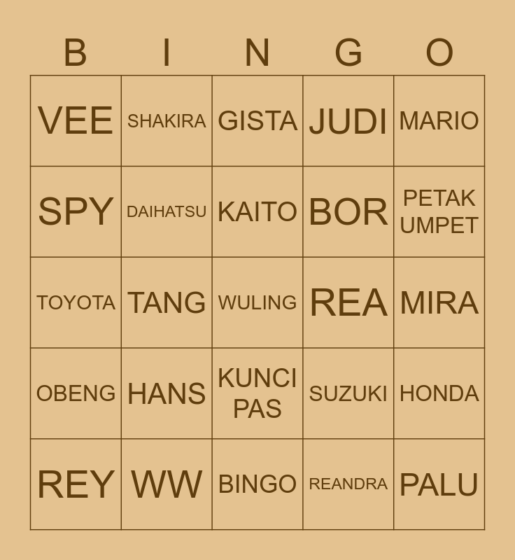 This bingo card has a free space and 24 words: REY, HANS, KAITO, REANDRA, MARIO, VEE, SHAKIRA, GISTA, REA, MIRA, TOYOTA, DAIHATSU, SUZUKI, HONDA, SPY, WW, BINGO, JUDI, PETAK UMPET, OBENG, TANG, KUNCI PAS, BOR and PALU.