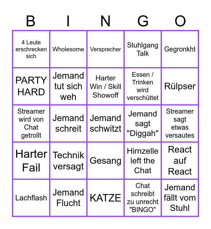 This bingo card has 25 words: Harter Fail, Jemand Flucht, Jemand schwitzt, Chat schreibt zu unrecht "BINGO", Gegronkht, 4 Leute erschrecken sich, Wholesome, Versprecher, Jemand sagt "Diggah", React auf React, PARTY HARD, Jemand tut sich weh, KATZE, Hirnzelle left the Chat, Rülpser, Lachflash, Jemand schreit, Harter Win / Skill Showoff, Essen / Trinken wird verschüttet, Streamer sagt etwas versautes, Streamer wird von Chat getrollt, Technik versagt, Gesang, Stuhlgang Talk and Jemand fällt vom Stuhl.