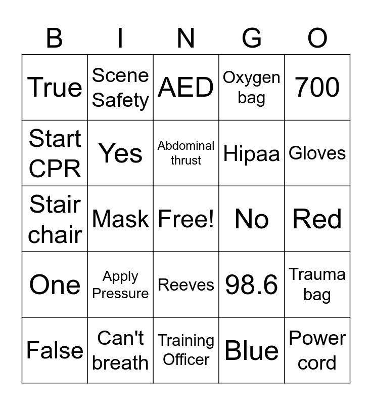 This bingo card has a free space and 24 words: Apply Pressure, Can't breath, Abdominal thrust, False, 700, True, Start CPR, Scene Safety, No, Reeves, Hipaa, Stair chair, 98.6, Trauma bag, Yes, Blue, Red, AED, Gloves, Mask, Power cord, One, Oxygen bag and Training Officer.