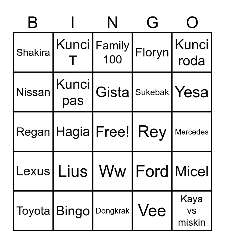 This bingo card has a free space and 24 words: Lius, Bingo, Gista, Toyota, Kunci roda, Shakira, Nissan, Kunci T, Rey, Ww, Sukebak, Regan, Ford, Micel, Kunci pas, Vee, Mercedes, Family 100, Yesa, Hagia, Kaya vs miskin, Lexus, Floryn and Dongkrak.