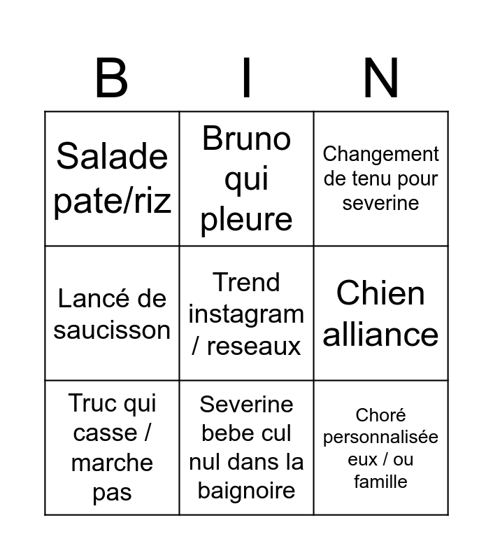 This bingo card has a free space and 8 words: Chien alliance, Changement de tenu pour severine, Bruno qui pleure, Truc qui casse / marche pas, Salade pate/riz, Choré personnalisée eux / ou famille, Lancé de saucisson and Severine bebe cul nul dans la baignoire.