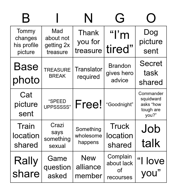 This bingo card has a free space and 24 words: Crazi says something sexual, Game question asked, Translator required, Rally share, Dog picture sent, Tommy changes his profile picture, Base photo, Mad about not getting 2x treasure, “Goodnight”, Something wholesome happens, Brandon gives hero advice, Cat picture sent, Truck location shared, Job talk, TREASURE BREAK, Complain about lack of recourses, Commander squidward asks “how tough are you?”, Thank you for treasure, Secret task shared, “SPEED UPPSSSSS”, “I love you”, Train location shared, “I’m tired” and New alliance member.